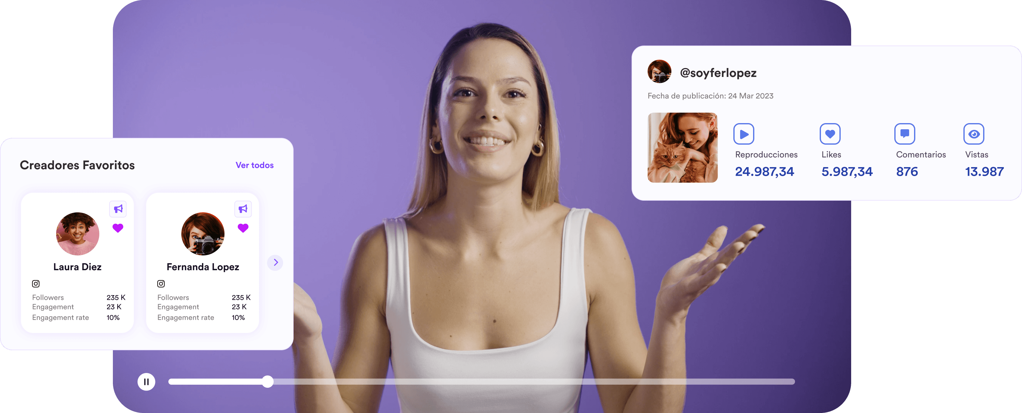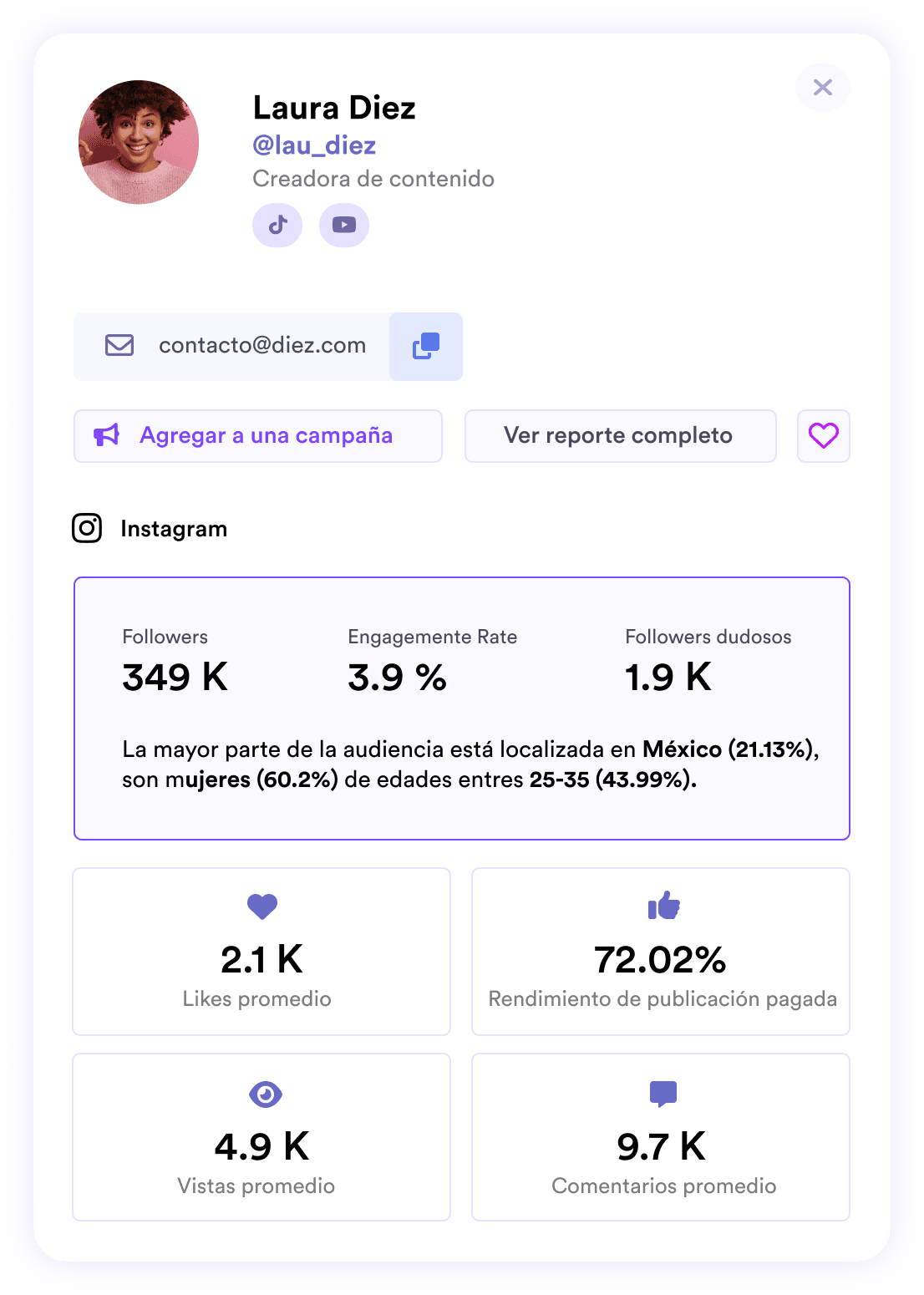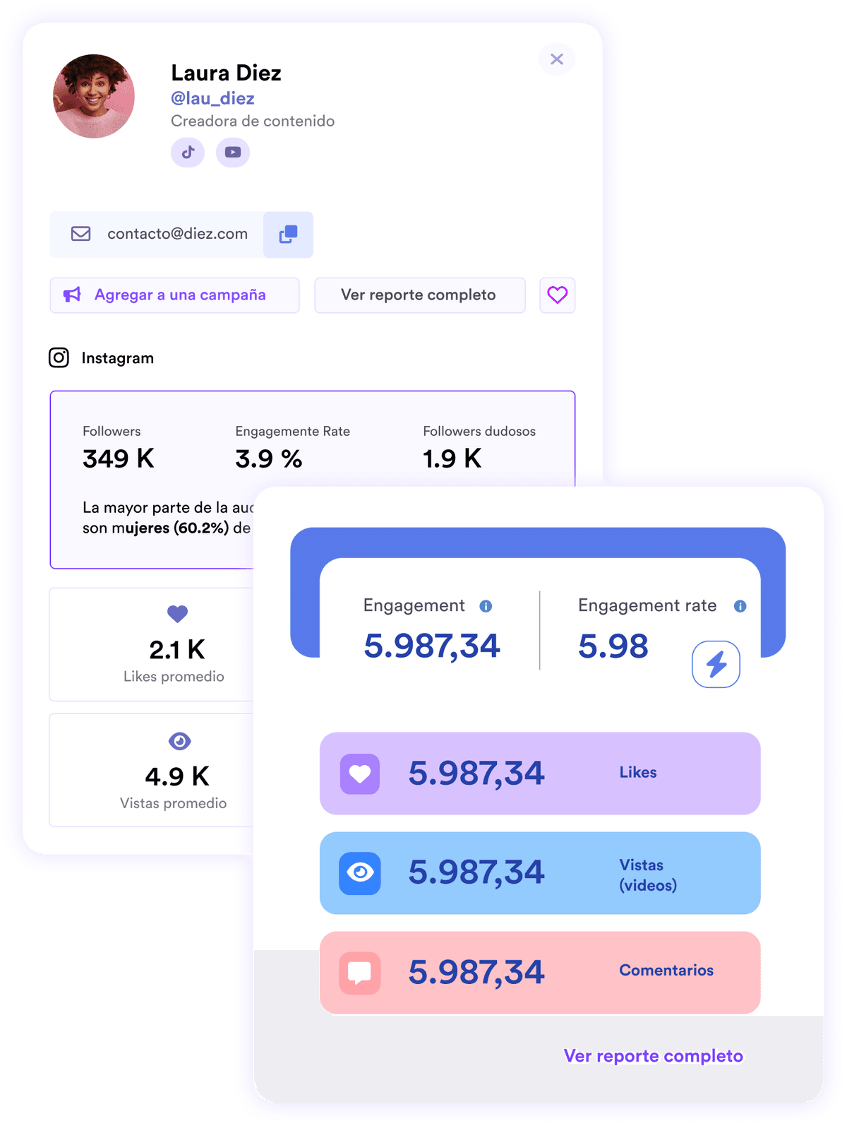 Encuentra a los influencers perfectos para colaborar con tu marca y evalúa el rendimiento de tus campañas, todo en un mismo lugar.